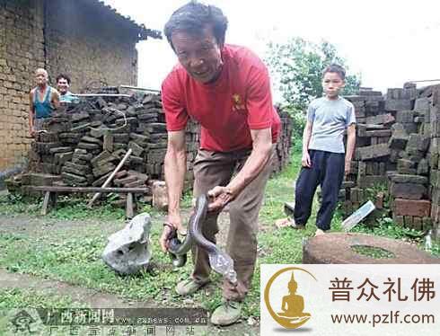 放生。 4月25日,记者赶到平乐县同安镇沙江村。 当记者表示想看看“龙珠蛇”时,老周从屋里拿出一个直径约1米的铁笼子,笼子里面放着一条烂裤子,一条蛇躺在上面睡觉。附近的村民立刻围上来想看个究竟。老周先是在手上抹了层药粉,然后喝了口药酒喷在手臂上,伸手进笼子捞出那条蛇放在地上。老周一跺脚,受惊的蛇立刻“呼”的一声,“嘶嘶”地吐着舌信子立起上身,颈部鼓得扁平。让人称奇的是,这条蛇头顶上长着3颗白色的“珍珠”,呈三角形状排列。 在老周捏住蛇嘴巴时,记者摸了下蛇头上的珠子,感觉十分光滑,表面有一层珍珠质,坚硬而有光泽。蛇的背面通体黑亮,腹面则是浅褐色,后脑长着细小的鳞片,与蛇颈部的鳞片明显不同,3颗“珍珠”像一顶皇冠。 当记者问及这条“怪”蛇的名称时,老周说他以前从一本叫《动物志》的书里看到,这种蛇在民间叫“龙珠蛇”,属于眼镜蛇类,非常稀罕。老周说,这条蛇有1.1米长,重0.6公斤,是公蛇。 说起这条“龙珠蛇”的来历,老周介绍说,去年他就听一名砍柴人说,在离村6公里远的一个半山腰水潭处看到过一条头顶珠子的蛇。2008年12月3日,他终于见到了这条“顶头珠”,但当时他并不敢抓,因为没有配好蛇药。他回到家里找来《中药图谱》,查找专门治此蛇的药,并根据自己多年的捕蛇经验配好了药。之后他又去了五六次,但都没见到此蛇。 今年3月底,老周在上山挖草药时,又见到了此蛇,他立即在手上抹上药将它抓了回来,并根据《动物志》上的喂养方法,跑到市场上买乌龟,用乌龟粪便喂蛇。 今年50岁的老周,捕蛇、治蛇伤的本事是他年轻时跟蒙山县一位老人学的。多年来,他捕来蛇专门帮助附近的村民治疗风湿病痛,并救治过许多被蛇咬伤的病人。他抓到“龙珠蛇”的消息一传出,附近的村民甚至是桂林城里的人纷纷而来,一睹“怪”蛇真容。有人出价8000元,想购买“龙珠蛇”,被他一口回绝,他打算等个好天气,将“龙珠蛇”放回大自然。 4月25日、26日,记者联系了南宁动物园、桂林七星动物园及广西高校搞动物研究的多名专家。他们在看了记者传递的“龙珠蛇”图片后表示:从未听过、也没有见过这种蛇!有的专家认为该蛇头上长有3颗珠子不可思议;另有一名教授认为蛇头上长珠子可能是环境变化引起的;南宁动物园的一位专家则建议记者在网上发布信息,寻求帮助。 记者在网上输入“眼镜蛇”,获悉我国的眼镜蛇大多是指眼镜王蛇,是国家一级保护动物。随后记者多次在网上键入“龙珠蛇”、“顶头珠”、“珍珠蛇”,收索的结果让人失望,没有这方面的点滴资料。